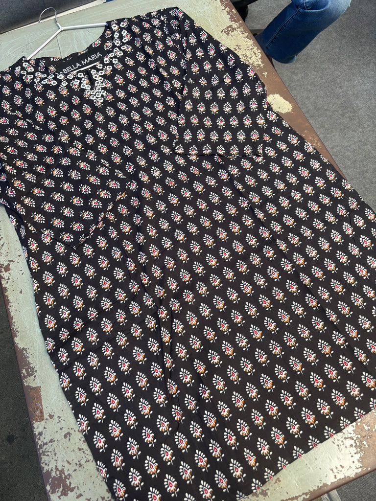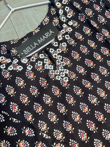 Printed kurti with embroidery on neck line.