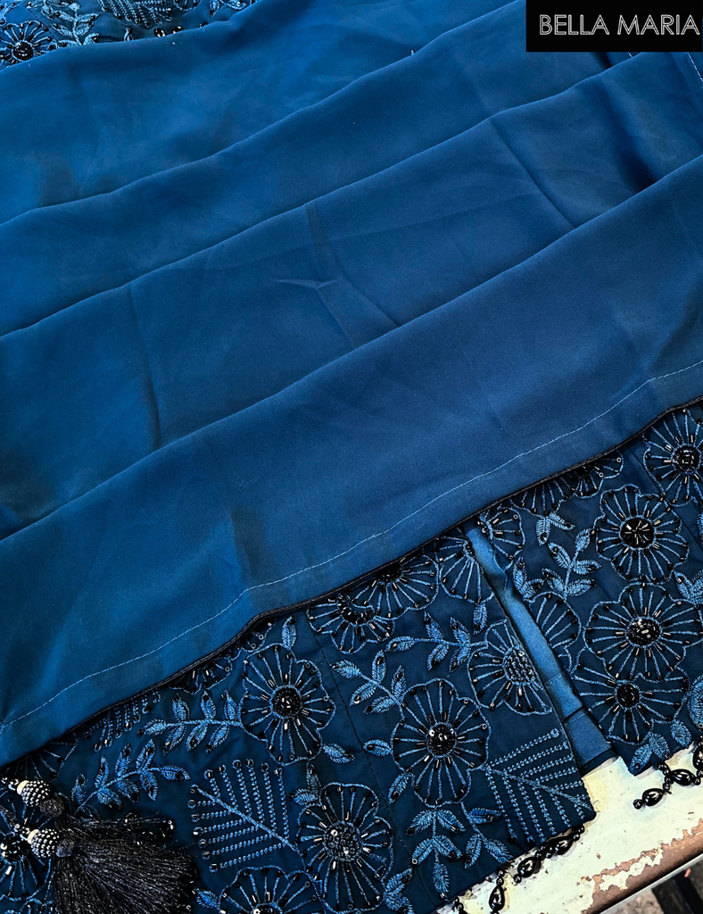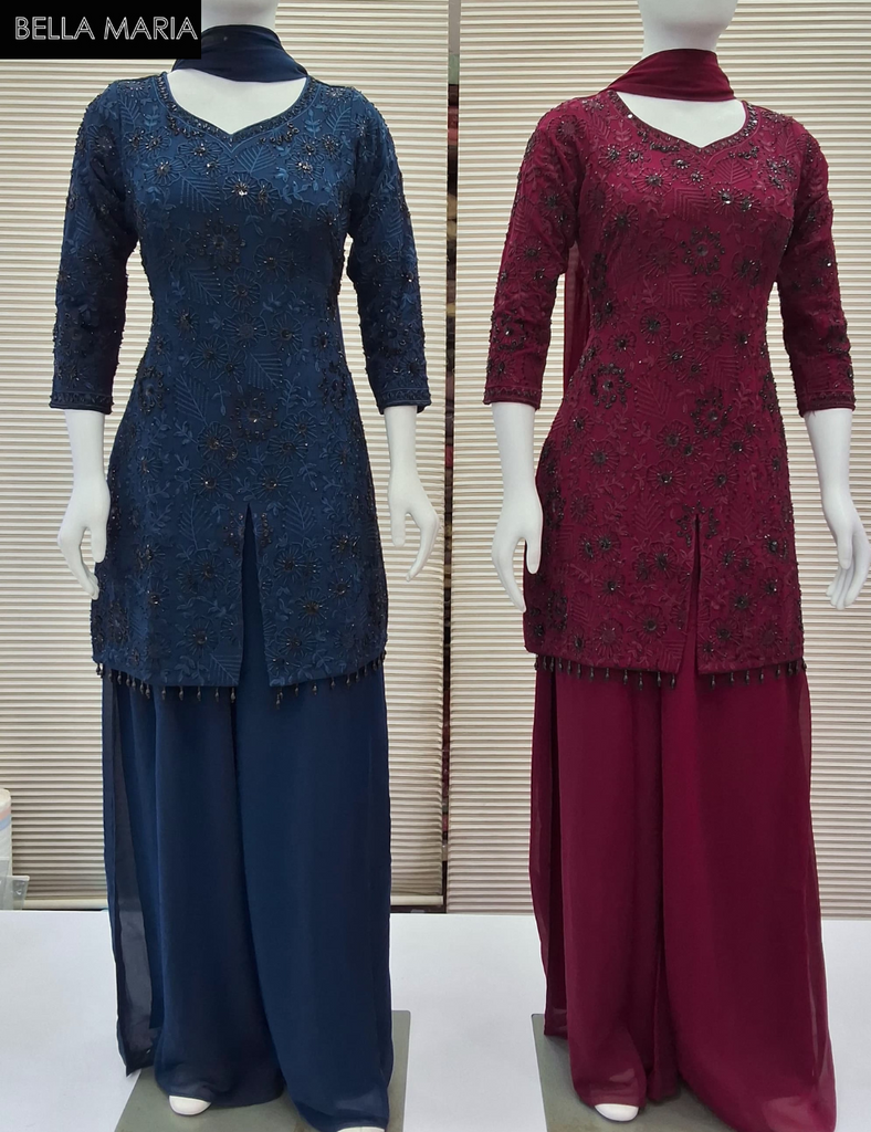 Three piece suit with embroidered kameez. Slim dupatta with tassels and wide plazzo.