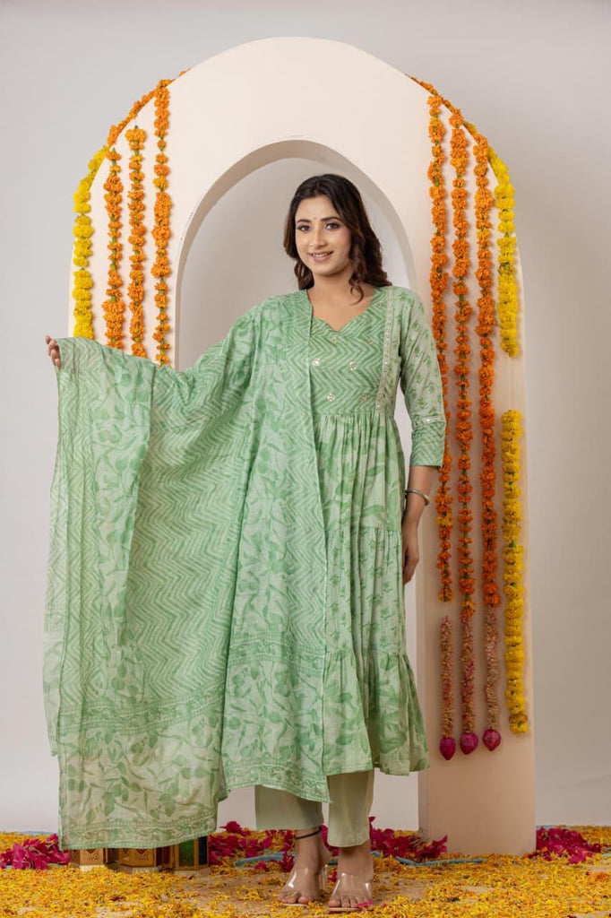 Floral cotton dress with embroidery. Printed cotton dupatta and straight trouser.