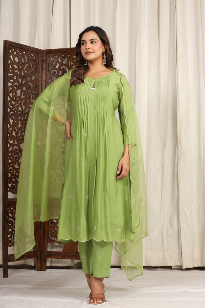 Floral cotton dress with embroidery. Printed cotton dupatta and straight trouser.