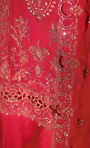 Kameez with sequins/pearl embroidery and cutwork. Embroidered dupatta. Raw silk plazzo.
