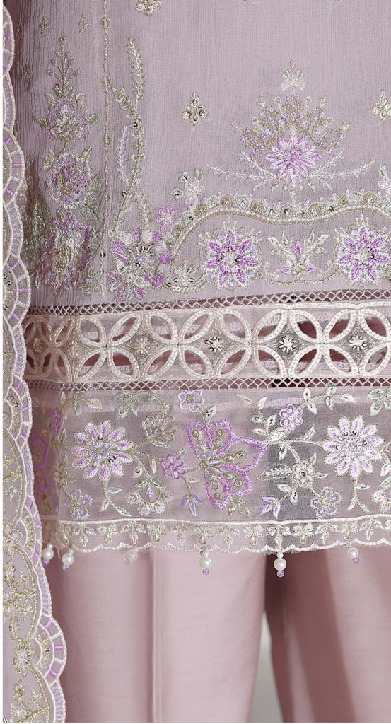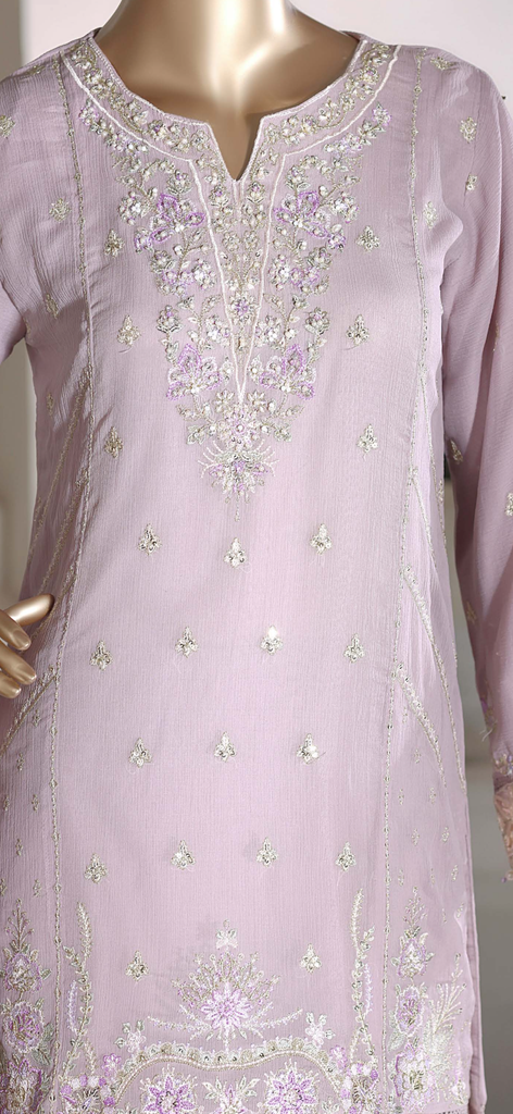 Kameez with sequins/pearls embroidery and cutwork. Embroidered dupatta. Raw silk pants.