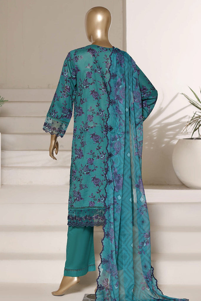 Chikan kari embroidered kameez with lace. Printed chiffon dupatta with embroidery.Trouser with lace.